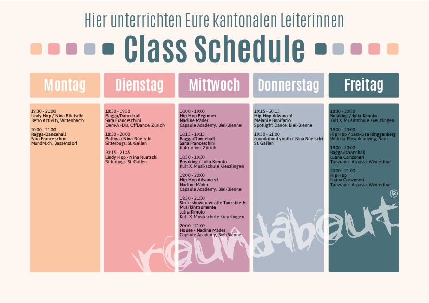 An einem der Tanztrainings der roundabout Leiterinnen teilnehmen? Der Stundenplan zeigt dir, wo welche kantonale Leiterin sonst noch unterrichtet!