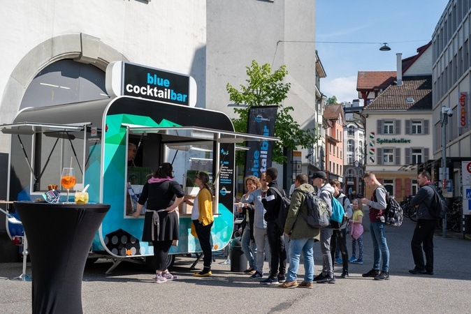 Das Blaue Kreuz St. Gallen – Appenzell hat seinen Blue-Cocktail-Bar-Stand in ein Mobil umgewandelt und diesem den Namen «blueliner» gegeben. Damit tingeln die Barmixer durch die Ostschweiz und ziehen neugierige Blicke auf sich. «Der Einsatz des Barteams war von A bis Z absolut grandios und hochprofessionell», meint Damian Caluori von den Sozialen Diensten Sarganserland. Ob eine private Gartenparty, ein hippes Festival oder eine Strassenaktion – das Blaue Kreuz ist bei den Leuten!