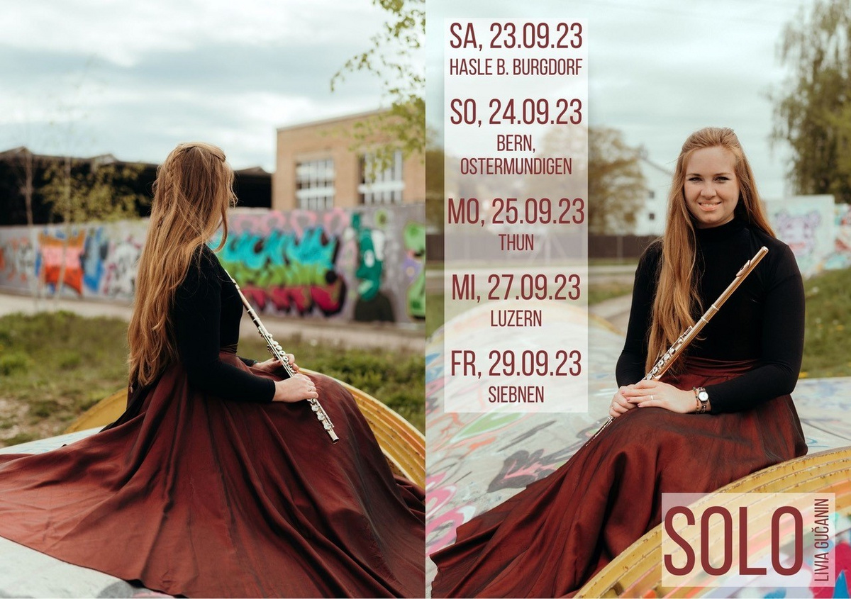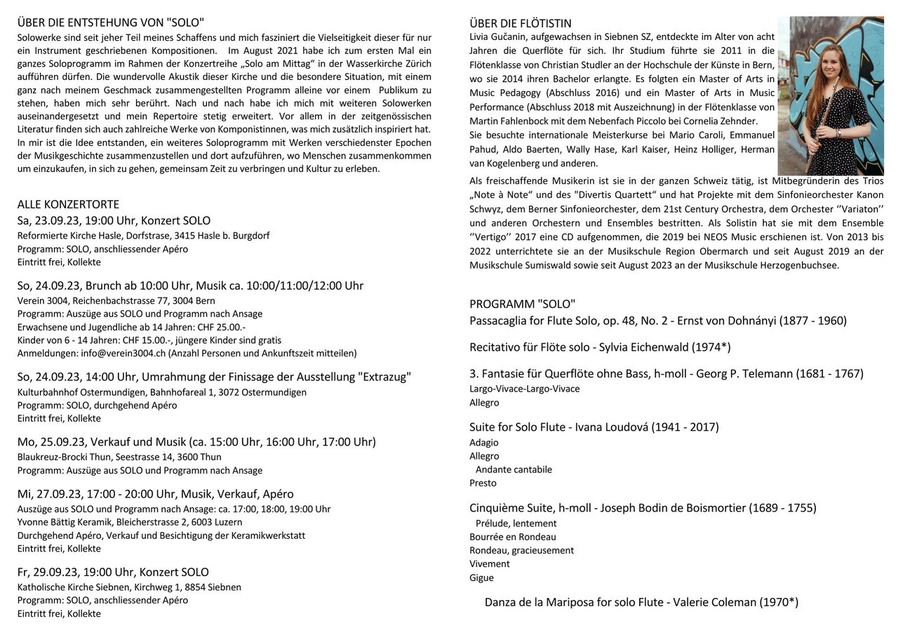 Livia Gučanin, Konzertflötistin mit Masterabschlüssen, gibt jeweils zur vollen Stunde um 15:00, 16:00 und 17:00 während je 20 Minuten ein Konzert und spielt dabei Auszüge aus ihrem Programm SOLO.