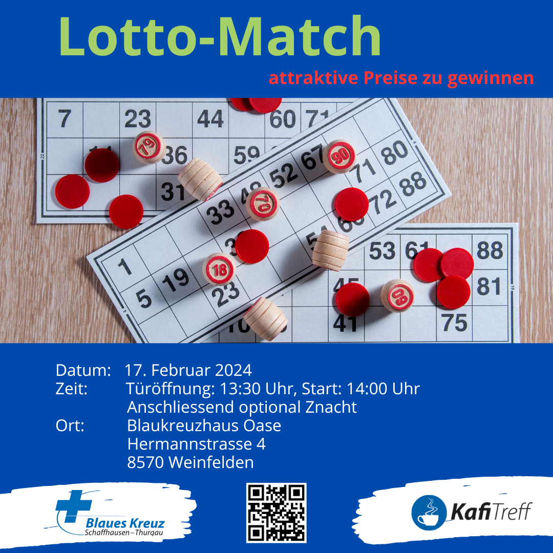 Am 17. Februar werden in der OASE wieder Zahlen gezogen. Wir laden herzlich zum nächsten Lottomatch ein. Attraktive Preise warten auf die Gewinnenden! Um 13.30 Uhr werden die Türen geöffnet, um 14 Uhr beginnt das Spiel. Im Anschluss gibt es optional für hungrige Bäuche ein einfaches Abendessen. Lass dir diesen Anlass nicht entgehen!
