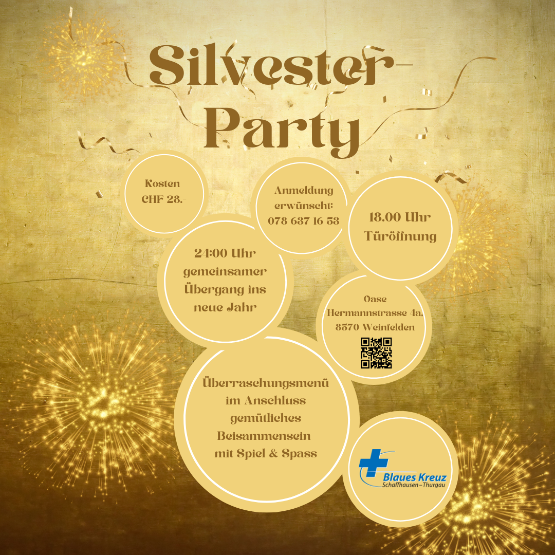 Wer gerne einen feierlich, unbeschwerten Silvester-Abend in einem überschaubaren Kreis von Menschen verbringen möchte, ist herzlich eingeladen, an der Silvesterparty in der OASE teilzunehmen. Ein Festessen und verschiedene Spiele in entspannter Atmosphäre lassen das Jahr 2023 angenehm ausklingen. Um Mitternacht wird alkoholfrei auf das neue Jahr angestossen. Das 2024 fängt so mit Sicherheit gut an! SO 31.12.2023 Türöffnung um 18 Uhr. Anmeldung direkt bei Erika Anderwert.