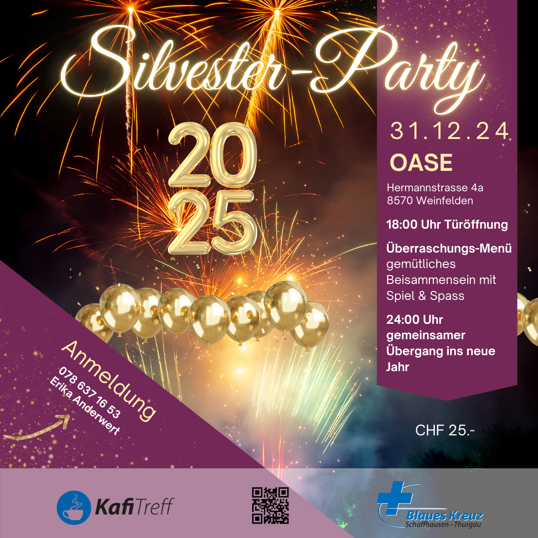 Wer gerne einen feierlich, unbeschwerten Silvester-Abend in einem überschaubaren Kreis von Menschen verbringen möchte, ist herzlich eingeladen, an der Silvesterparty in der OASE teilzunehmen. Ein Festessen und verschiedene Spiele in entspannter Atmosphäre lassen das Jahr 2024 angenehm ausklingen. Um Mitternacht wird alkoholfrei auf das neue Jahr angestossen. Das 2025 fängt so mit Sicherheit gut an! Di. 31.12.2024 Türöffnung um 18 Uhr. Anmeldung direkt bei Erika Anderwert.