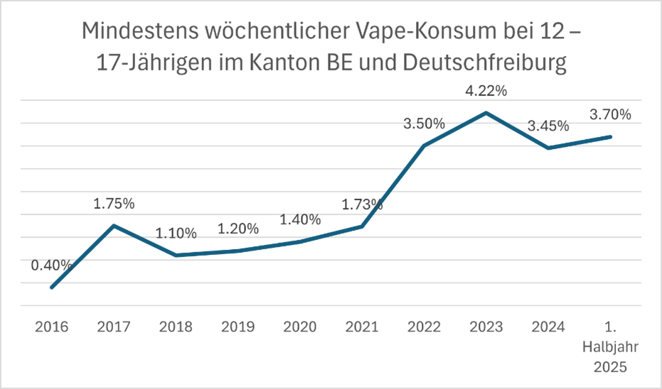 Über 10 Jahre betrachtet, zeigt sich auch beim zunehmenden Vape-Konsum von Jugendlichen ein ähnliches Bild wie bei der Gesamtbevölkerung. Die neuen Produkte sind billig, leicht verfügbar und zielen mit süssen Aromen und farbenfrohem Design besonders auf Jugendliche.