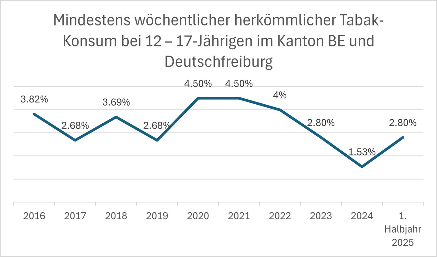 Die neusten Zahlen weisen zudem beim herkömmlichen Rauchen eine Zunahme aus. Nachdem der wöchentliche Tabakkonsum über mehrere Jahre hinweg leicht gesunken war, ist nun wieder ein leichter Anstieg erkennbar.