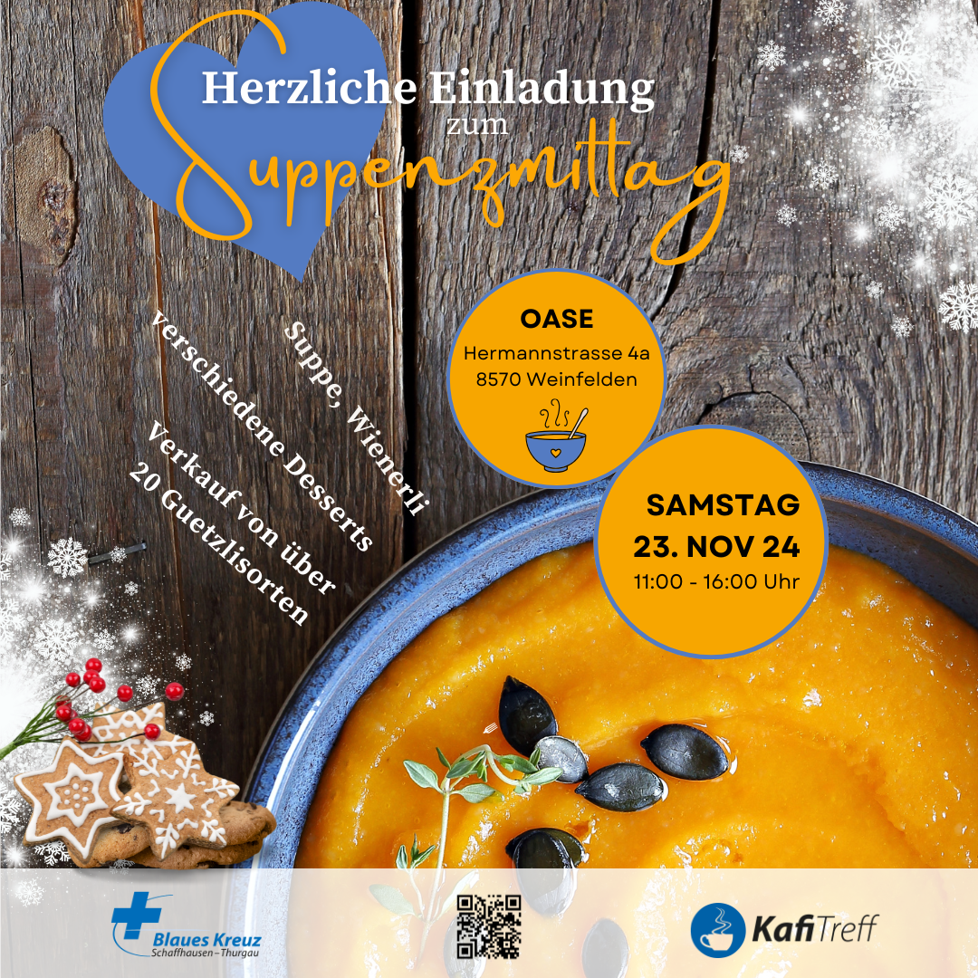 Von 11 bis 16 Uhr wartet eine leckere Suppe mit oder ohne Wienerli auf illustre Gäste mit einem gesunden Appetit. Ebenso lockt das grosse Kuchen- und Dessertbuffet zu einem Besuch in der Oase in Weinfelden. Zum Verkauf werden über 20 Sorten selbstgemachte Weihnachtsguetsli sowie weitere Köstlichkeiten aus der Küche angeboten.Kommen Sie an unseren jährlichen Suppentag, in der Oase in Weinfelden und lassen Sie es sich schmecken.