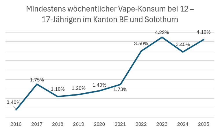 Der herkömmliche Tabakkonsum hat in den letzten Jahren bei den Minderjährigen im Kanton Bern leicht abgenommen. Anders sieht das Bild bei den alternativen Nikotinprodukten aus. Vapes sind gesellschaftlich im Trend. Die neuen Produkte sind billig, leicht verfügbar, und zielen mit süssen Aromen und farbenfrohem Design besonders auf Jugendliche ab. Die Vermarktung erweckt den Eindruck, dass Vapes harmlose Produkte sind. Das darin enthaltene Nikotin kann jedoch rasch zu einer Abhängigkeit führen und bei Kindern und Jugendlichen die Hirnentwicklung negativ beeinflussen. Ob und wie weit die neuen Nikotinprodukte und deren gezielte Vermarktung auch den herkömmlichen Tabakkonsum von Jugendlichen beeinflussen, werden die nächsten Jahre zeigen. Im Moment gibt es lediglich Anzeichen dafür, dass Jugendliche verschiedene Nikotin- und Tabakprodukte gleichzeitig konsumieren.