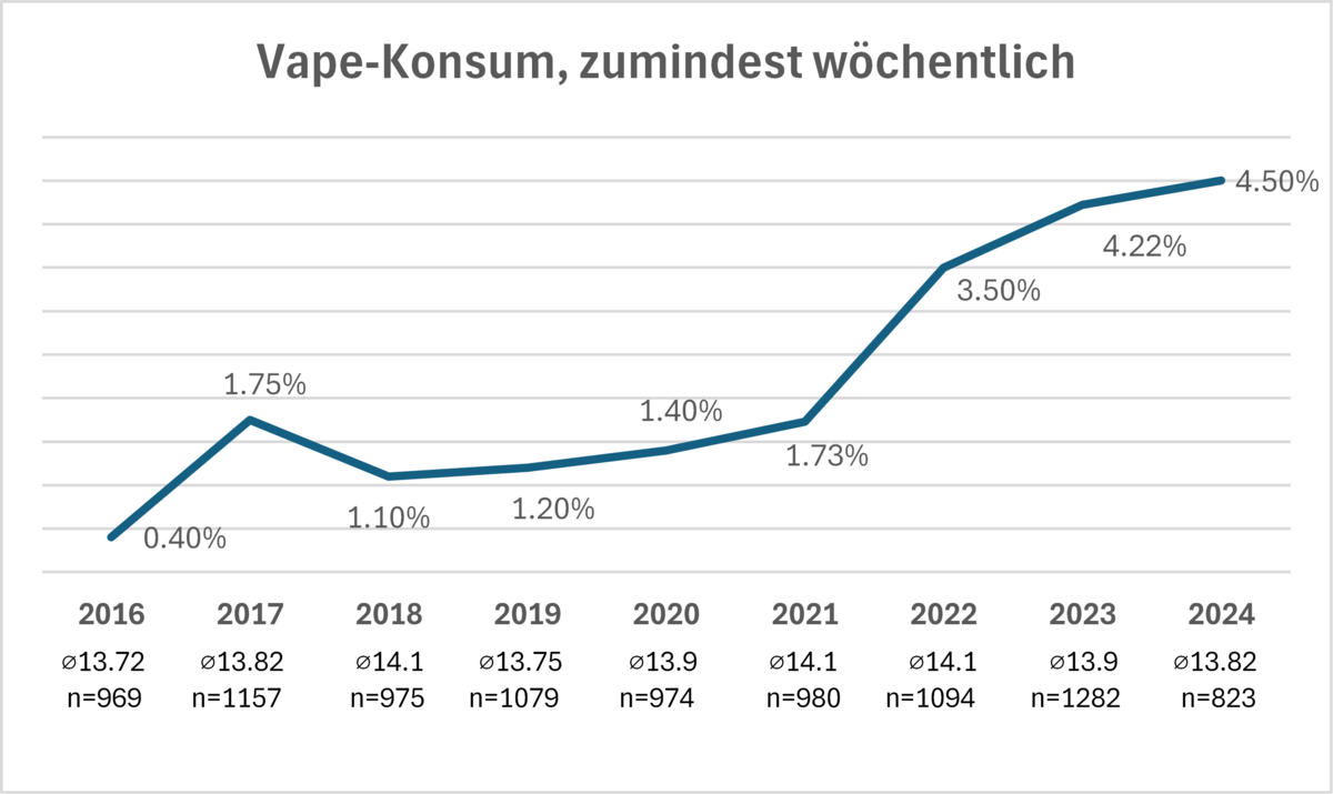 Für die Analyse wurde bewusst der zumindest wöchentliche Konsum von Substanzen gewählt, da so eher eine Aussage zum problematischen Konsum getroffen werden kann. Zudem wurde lediglich die zumindest zweimalige Trunkenheit berücksichtigt. Auffallend ist, dass der zumindest wöchentliche Alkoholkonsum von 1,7 % im Jahr 2019 auf 7,5 % im Jahr 2022 anstieg. Auch die Trunkenheit nahm in derselben Zeitperiode zu (2019; 3,3 %, 2022: 8,7 %). Die gleiche Tendenz zeigt sich auch beim Snus/Schnupftabak (2019; 2.8 %, 2022; 5.8 %) sowie beim Rauchen. Erfreulicherweise zeigen alle oben genannten Zahlen seit dem Jahr 2023 wieder nach unten. Das Rauchen liegt im bisherigen Jahr aussergewöhnlich tief. Im Jahr 2016 rauchten 3,8 % zumindest wöchentlich, in den Jahren 2020/2021 waren es 4,5 %, und im aktuellen Jahr liegt der Wert nur noch bei 1,5 %. Es wird also deutlich weniger geraucht, und dieses Phänomen steht vermutlich mit dem Anstieg des Vape-Konsums in Zusammenhang.