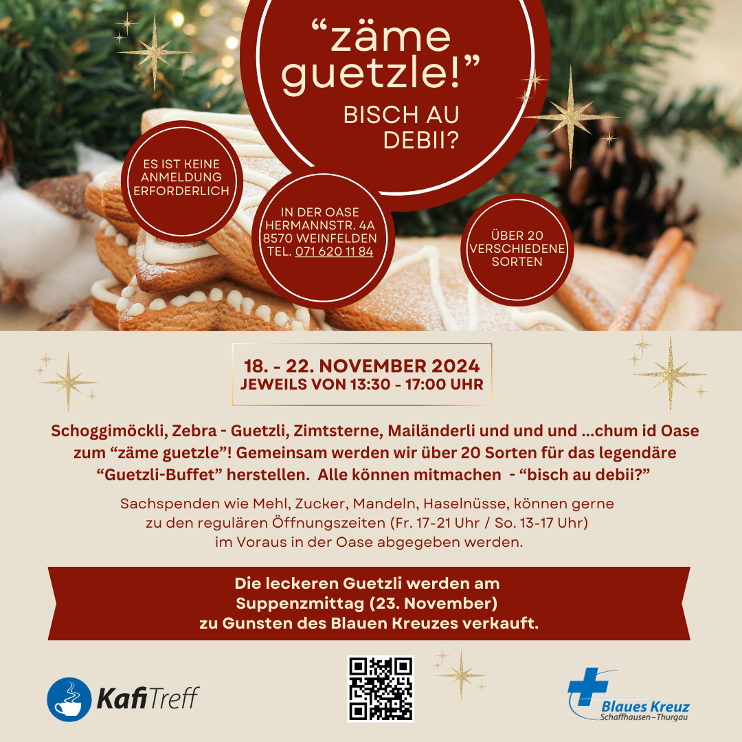 Schoggimöckli, Zebra - Guetzli, Zimsterne, Mailänderli und und und ...chum id Oase zum “zäme guetzle”! Gemeinsam werden wir über 20 Sorten für das legendäre “Guetzli-Buffet” herstellen. Alle können mitmachen - “bisch au debii?”