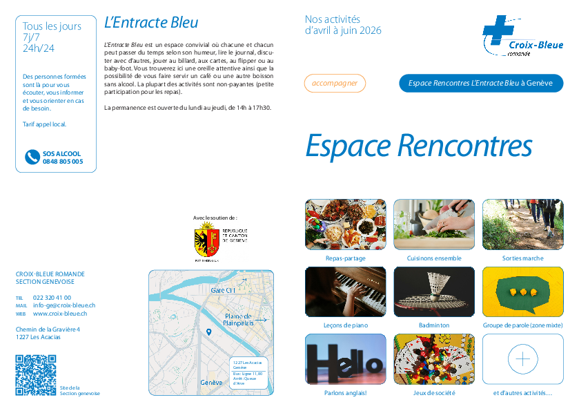 Bienvenue à l’Entracte Bleu, lieu de convivialité où de multiples activités s’offrent à vous ainsi que la possibilité de développer un nouveau réseau de relations. Grâce à nos bénévoles passionnés, il y a de fortes chances que vous puissiez trouver ce qui vous convient dans l’un des dix ateliers proposés, tant à l’intérieur qu’à l’air libre. Les mardis après-midi, notre permanence se transforme en un lieu de jeux de société. Un jeudi sur deux, des hommes comme des femmes se réunissent autour d’un sujet de discussion portant sur des thèmes aussi variés les uns que les autres. Ne manquez pas nos trois évènements phares mensuels, à savoir nos deux vendredis avec repas partage dès midi, ainsi que notre soirée du samedi en mode animation « by night » ! De plus, lorsque vous avez besoin d’être accompagné dans les défis qui sont les vôtres, notre équipe saura vous écouter, vous conseiller et vous orienter avec professionnalisme en s’adaptant à vos besoins et objectifs dans le but que vous puissiez poursuivre votre cheminement un pas à la fois, vers l’autonomie et l’estime de soi. Prendre soin de soi, voilà notre raison d’être !